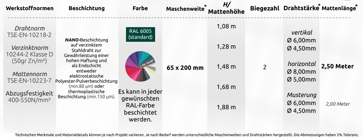 Im Gegensatz zu Standardpanelen bietet das Panel, das aus verzinkten Drähten hergestellt wird, Dekore, die die Beständigkeit erhöhen und ein ästhetisches Erscheinungsbild haben. Zusätzlich wurde es unter anderen ähnlichen Produkten aufgrund der Tatsache bevorzugt, dass es 2 "W"-förmige beständigkeitsverstärkende Verdrehungen und 2 zusätzliche Stäbe pro Verdrehung gibt.