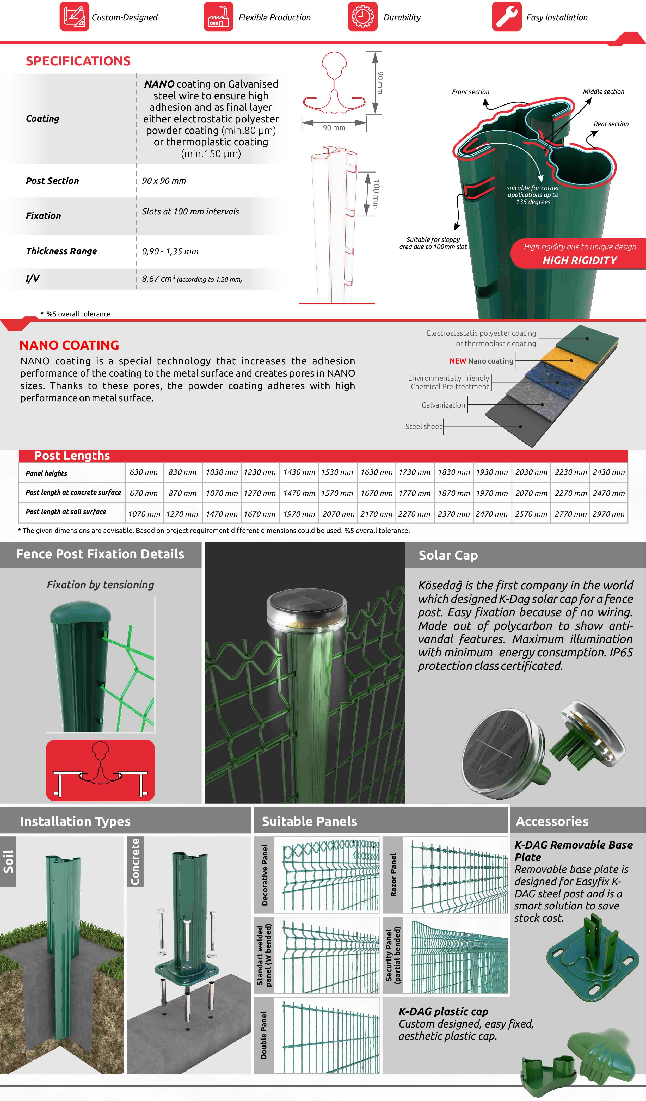K-Dag Metal Post is a galvanized post system with increased strength making it possible to install the panel to the post flaps thanks to its special cross section structure. Compatible with all the panel types. High resistance, strength and easy to install thanks to its special double layer design. Requires no fittings since it is attachable to the post flaps. This special system prevents the panel from being removed and, offers extra security against external security threats. It has a higher corrosion resistance since there is no need to drill holes during the assembly of the panel on the post. Long lasting. Losses that may occur during the conventional techniques such as cutting, welding, clamping etc. are completely eliminated since it is manufactured from a single sheet metal. Coating is not damaged since there is no need to drill any holes during the installation. Easy to install on slopping lands thanks to discharges on the post channels. There is no need to extra posts at corners and turnings. A solar cover may be added to the K-Dag Metal posts, which use plastic covers as a standard system.