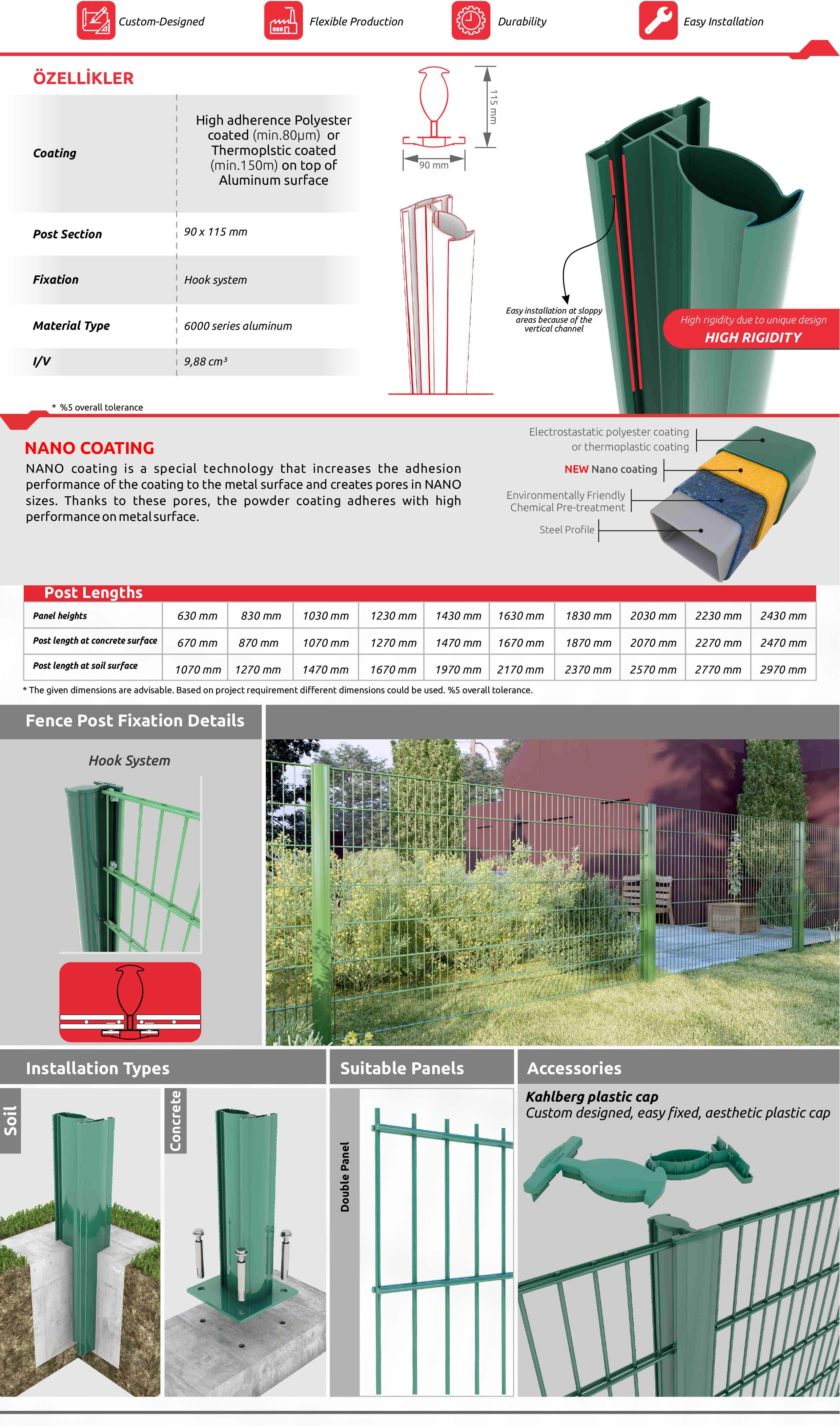 Kahlberg is an ideal fence post especially for construction markets since it is a secure product against interventions and, also easy to install. Prevents the wire from being dismantled from outside since there is no connection, assembly, clipping, screwing and fitting parts on the exterior surface. Fast and easy to install thanks to its unique design. Panels mounted to the posts from inside eliminates any difficulties in respect of installation and occupational safety risks in case of application on sites with higher frontages. Possible to angle and slope the panels during the installation on slopping lands thanks to the flaps on the front face of the posts. Possible to install on any type of graded walls and lands considering the different elevations and grades without the need for any discharging and forms on the post flaps. Posts with flaps and channels, fixed on apparatus or ability to install subsequently, possible to install the system with a single apparatus, need for extra posts and accessories in case of slopping, graded lands.
