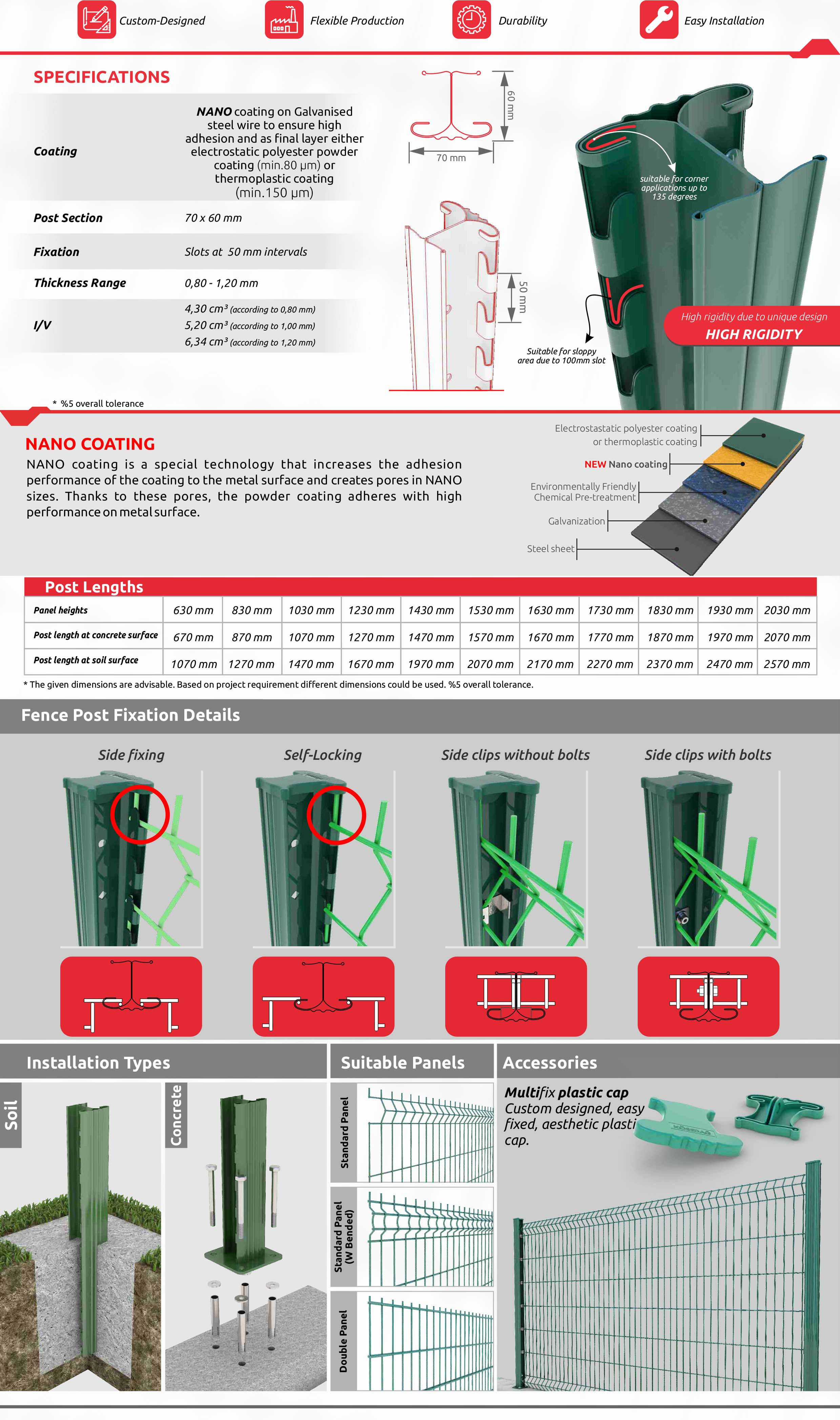 K-Dag Metal Post is a galvanized post system with increased strength making it possible to install the panel to the post flaps thanks to its special cross section structure. Compatible with all the panel types. High resistance, strength and easy to install thanks to its special double layer design. Requires no fittings since it is attachable to the post flaps. This special system prevents the panel from being removed and, offers extra security against external security threats. It has a higher corrosion resistance since there is no need to drill holes during the assembly of the panel on the post. Long lasting. Losses that may occur during the conventional techniques such as cutting, welding, clamping etc. are completely eliminated since it is manufactured from a single sheet metal. Coating is not damaged since there is no need to drill any holes during the installation. Easy to install on slopping lands thanks to discharges on the post channels. There is no need to extra posts at corners and turnings. A solar cover may be added to the K-Dag Metal posts, which use plastic covers as a standard system.