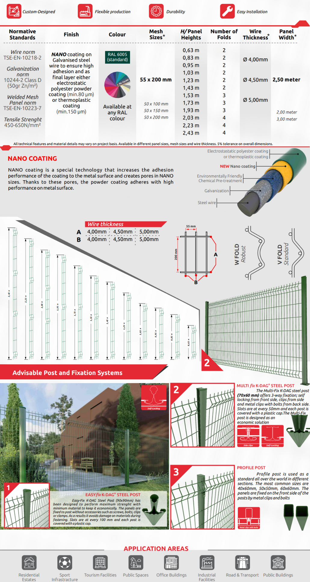 Kosedag’s Standard Welded Panel Fence System is the ideal substitute to chain link and woven fencing materials. Kosedag’s competitive rates and hardware free assembly methods make our Products a far more cost-effective range of solutions as well as a far more attractive offering. Kosedag’s Standard Welded Panel can be provided in a range of wire gauges, finishes as well as panel pressing designs.