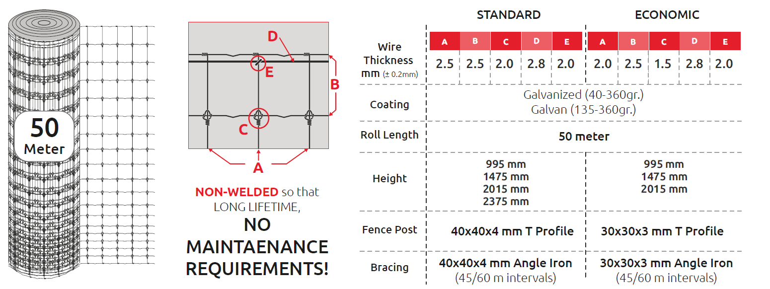 Knotted fence system, which has high corrosion resistance thanks to its weldless structure, is an economical fence system that can be used for many years without maintenance. Mesh size varies from 75mm to 180mm in international standards, thus preventing the passage of both sheep and cattle.