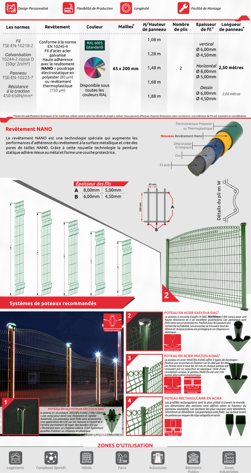 Kosedag utilise les meilleurs matériaux d'acier et de revêtement ainsi que les techniques de conception les plus récentes pour fournir la gamme de produits de clôture la plus attrayante et la plus décorative disponible sur le marché. La gamme de solutions de clôture déco de Kosedag est disponible dans une gamme de mailles, de finitions, de couleurs, de hauteurs et peut être fournie avec nos poteaux à encoches uniques K-dag qui éliminent les méthodes d'assemblage traditionnelles des produits de clôture. Les produits de clôture déco de Kosedag peuvent être assemblés sans qu'il soit nécessaire d'utiliser des fixations mécaniques pour relier le panneau au poteau. Une autre caractéristique très unique est notre capuchon de poteau à lumière solaire qui peut éclairer la ligne de clôture sans avoir à installer la moindre infrastructure électrique!