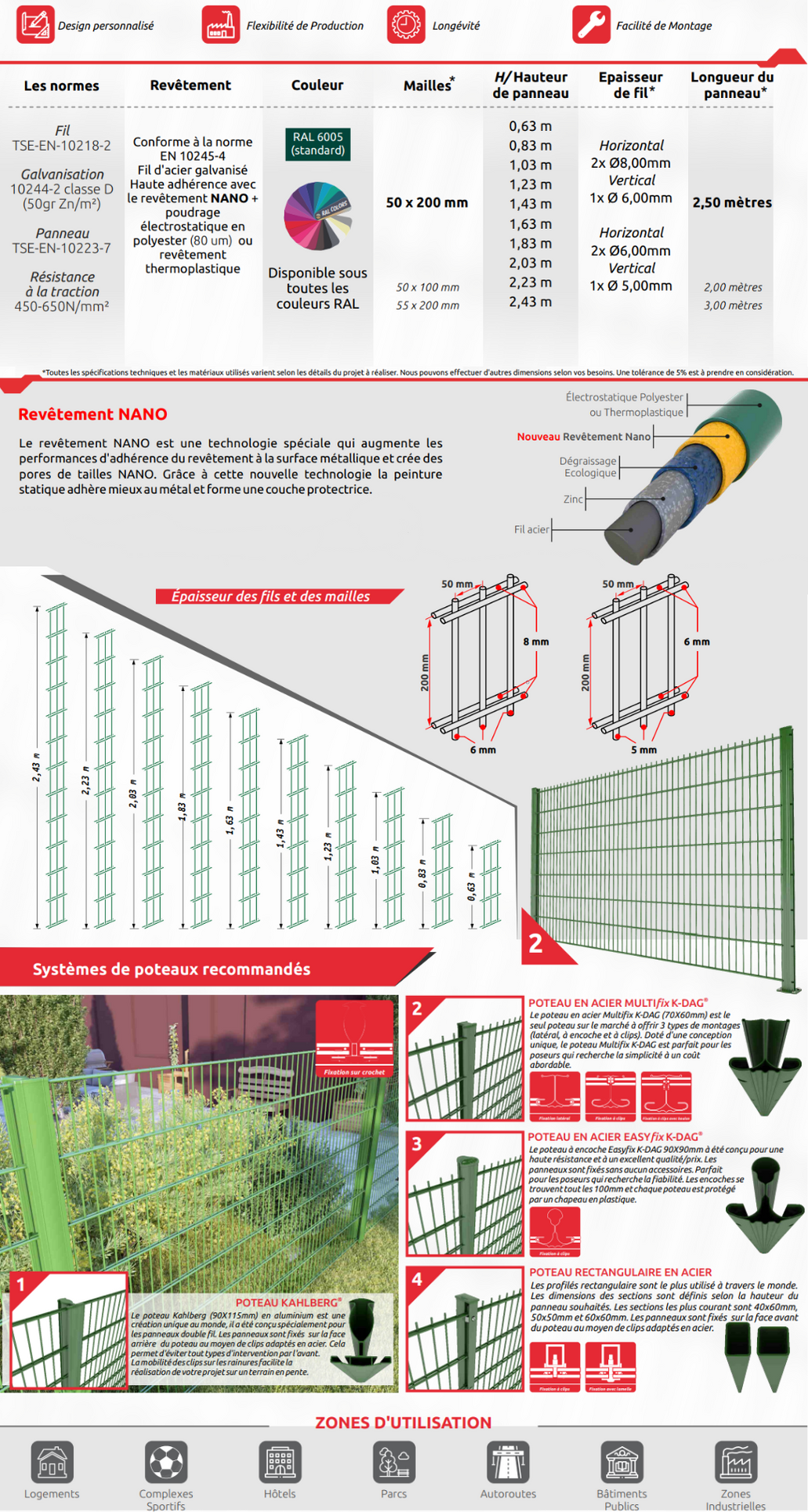 La clôture double fil d Kosedag est la solution idéale pour sécuriser les parcs et les installations récréatives, les terrains de sport et les stades, les concessions automobiles, les propriétés privées et d'autres types d'installations similaires. Le panneau est renforcé par un fil horizontal, à double ligne, intégré dans le panneau, ce qui augmente la rigidité du produit ainsi que sa solidité et sa finition globales. Le système peut être assemblé sans qu'il soit nécessaire d'utiliser des fixations mécaniques grâce au système de poteau à encoches K-dag. En ajoutant notre chapeau de poteau à lumière solaire, le périmètre de votre site sera embelli et mis en valeur la nuit grâce à nos capacités uniques de source d'éclairage intégrée et d'énergie renouvelable.
