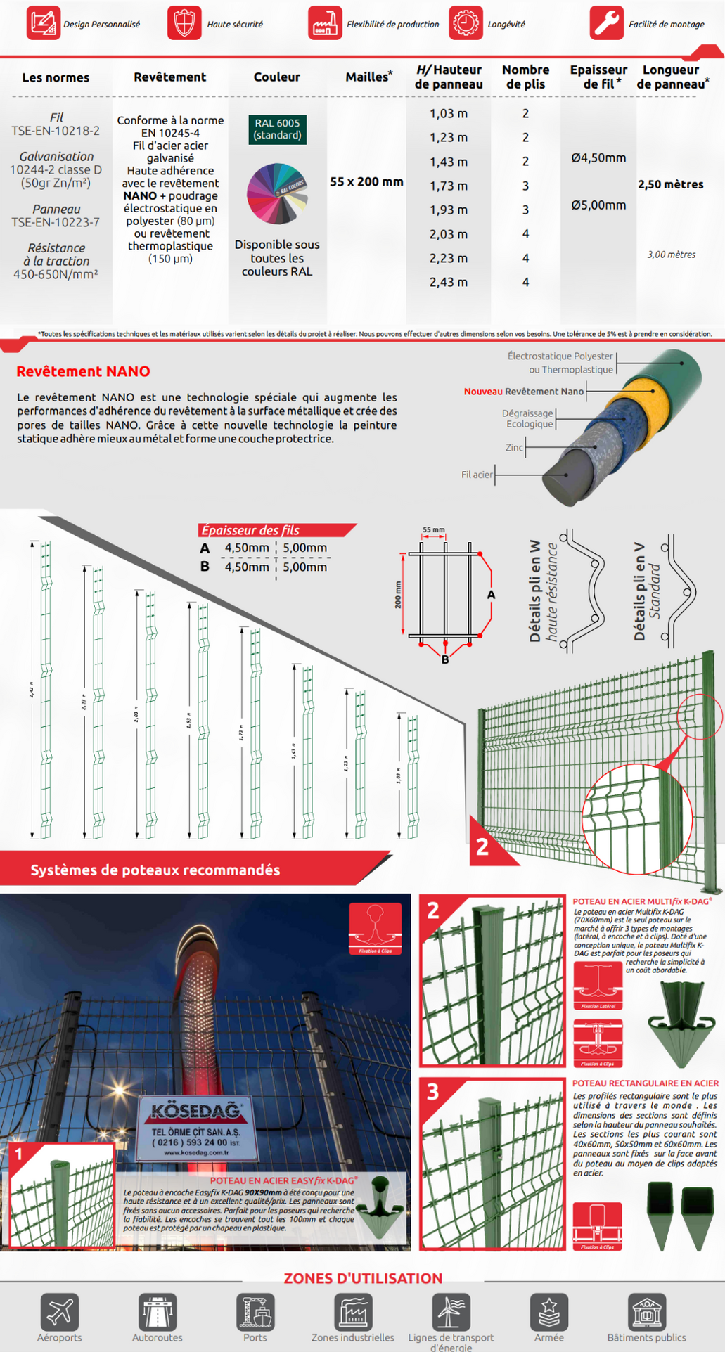 Kosedag a conçu et mis au point ce système pour remplacer le grillage simple torsion avec du fil barbelé. Ce produit de haute qualité et ce système de panneaux rigides sont de loin supérieurs à la maille du grillage simple torsion nécessitant des fixations pour les poteaux et le fil barbelé. Les panneaux Razor de Kosedag sont disponibles dans une gamme de hauteurs avec des lames soudées sur la partie haute pour éviter une escalade et garantir une sécurité du site. Cela signifie que le système de cette clôture est une solution intégrée qui ne nécessite pas de travaux d'installation secondaires ou de matériaux pour fournir une butée anti-escalade efficace puisqu'elle est soudée sur la partie haute du panneau pendant la fabrication !