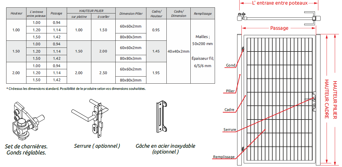 Il s’agit d’un portail à simple battant conçu pour l’entrée et sortir des piétons. Il est possible de les concevoir selon les hauteurs et longueurs désirées.