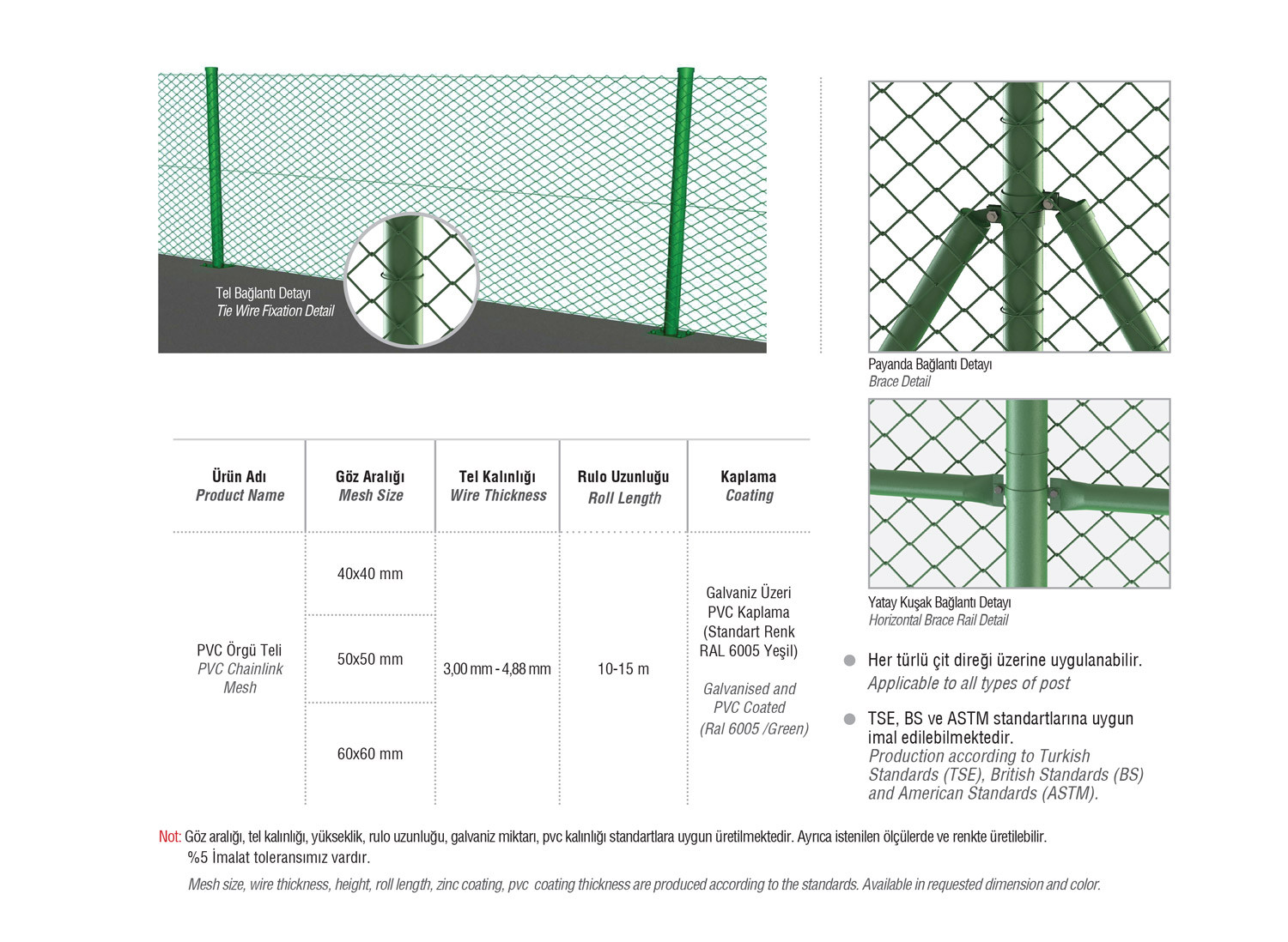 PVC Kaplamlı olarak olarak imal edilen örgü tel malzemesi, kullanım alanlarına göre istenilen yüksekliklerde üretilmektedir.