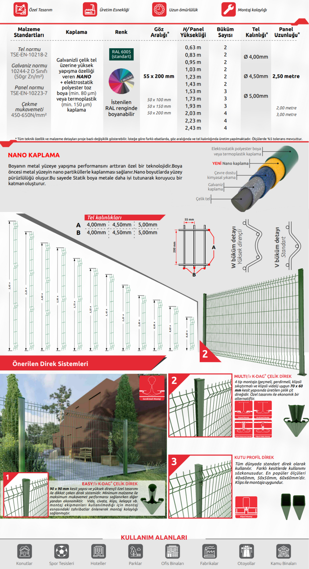 Bu çit çözümü, hemen hemen her siteyi sınırlandırmak için kullanılabilecek çok yönlü, kaliteli ve uzun ömürlü bir çözümdür.